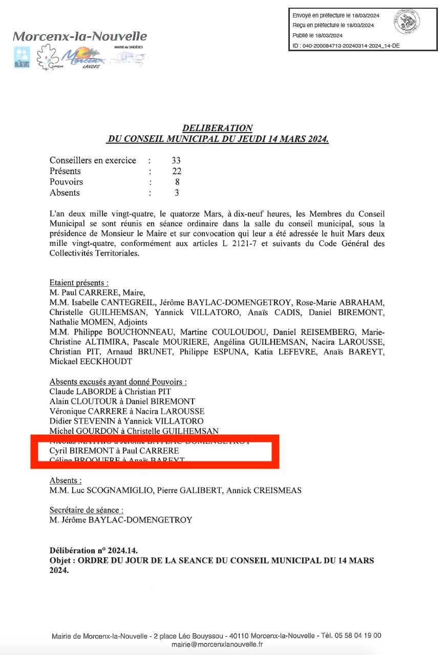 Alors que le Maire, comme l’exige la réglementation, débute son conseil municipal du jeudi 14 mars 2024 par un appel des élus présents autour de la table, il égrène également les pouvoirs écrits des absents, attribués aux élus présents. Tout se passe bien jusqu’au moment où celui-ci déclare :
